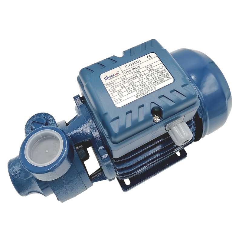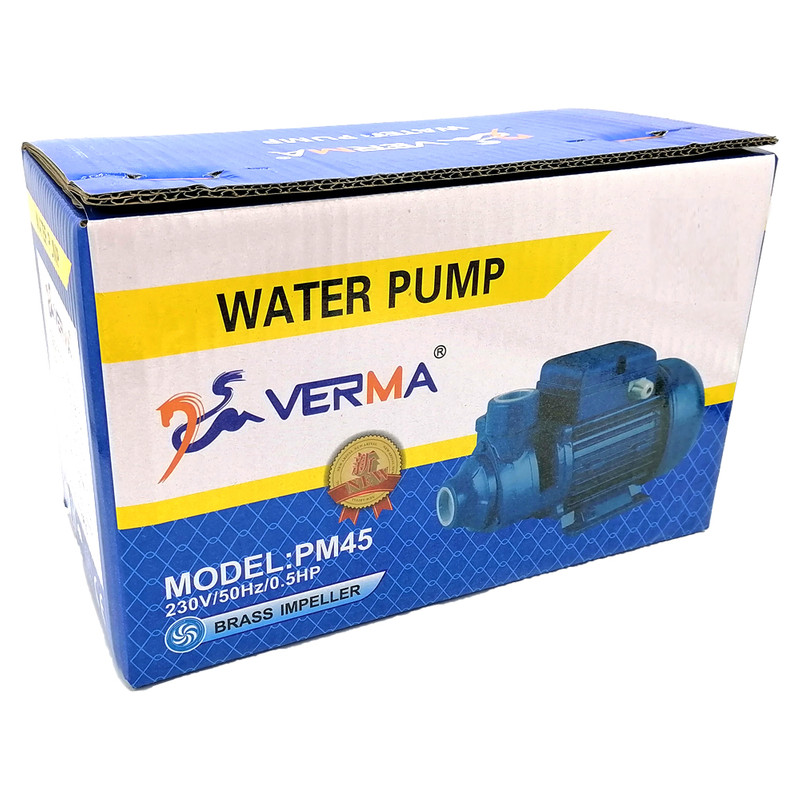 الکتروپمپ های محیطی سری PM دارای پروانه ای از جنس برنج که اصطلاحا پروانه خورشیدی نامیده میشود میباشند، این نوع پروانه با تیغه های شعاعی متعددی که در لبه آن است برای انتقال آب تمیز بدون ذرات جامد و مایعات غیر خطرناک مناسب است. این پمپ ها در کنار ساختار نسبتا ساده ای که دارند قابل اطمینان و ایمن هستند و استفاده از آنها برای واحدهای 1 یا 2 طبقه ، ساختمانهای ویلایی به صرفه می باشد. این پمپ ها به طور گسترده ای برای مصارف خانگی مثل تامین آب از چاه ها، افزایش فشار آب برای مصارف ساختمانی، صنعتی و تجاری مورد استفاده قرار می گیرند و باید در فضایی سرپوشیده نصب شوند. الکتروپمپ PM45 از سری پمپ های خانگی ورما با قدرت 0.5 اسب بخار و با دور موتور 2900RPM قادر است حداکثر ارتفاع (هد) 38متر و حداکثر آبدهی (دبی) 40 لیتر بر دقیقه را برای مصرف کننده تامین کند.