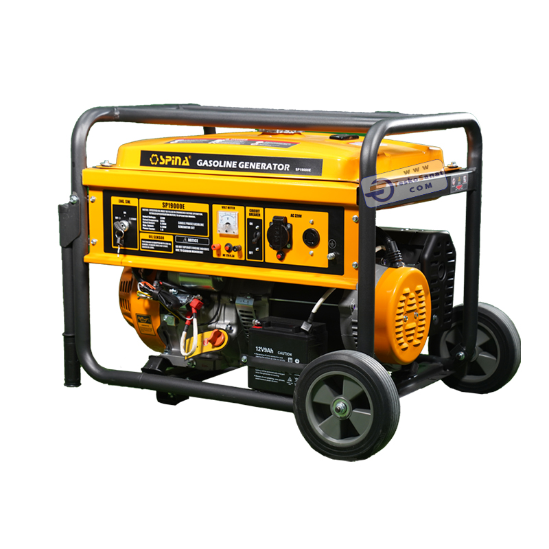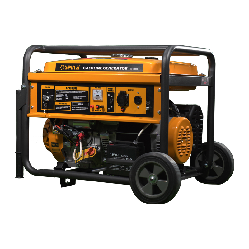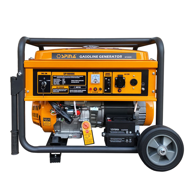 این موتوربرق دارای چرخ و دسته می باشد که جابه جایی را برای کاربر آسان می کند. موتور برق بنزینی اسپینا مدل SP19000E دارای سیستم سنسور سطح روغن ، سیم پیچی 100% مس، و کنترل نوسان برق AVR می باشد سیستم راه اندازی این موتور برق به صورت استارتی و هندلی می باشد.