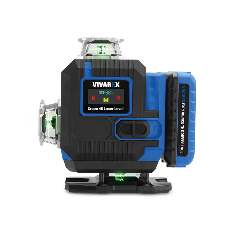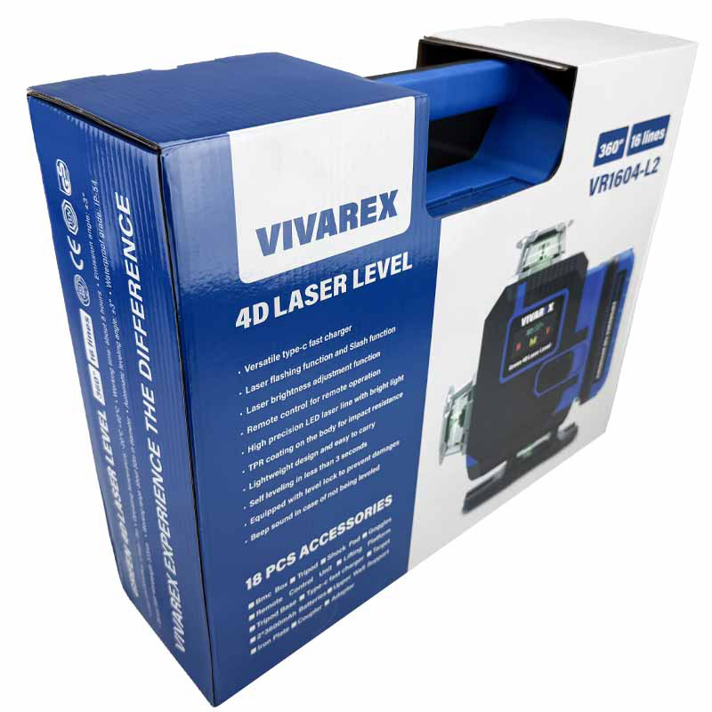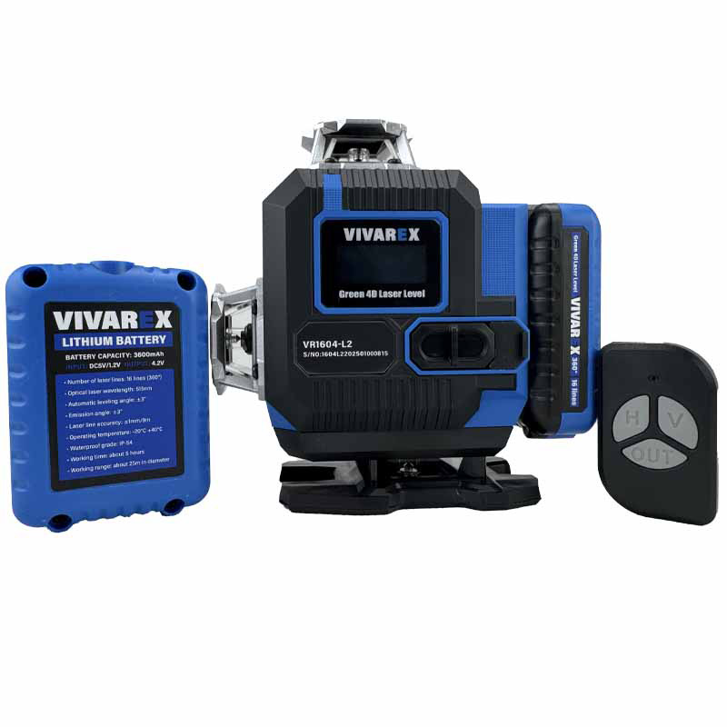 تراز لیزری 4D ۱۶ خط نور سبز VR1604-L2 دقت لیزر ای تراز 1/5 mm تا 10 mm می باشد و محدوده خط تراز آن ۳ اینچ بوده و نوع لیز آنر سبز کلاس II است.این محصول داخل کیف BMC مقاوم و ضد ضربه قرار دارد.دارای چند مدل پایه از جمله سه پایه تراز هم می باشد.باتری های این دستگاه از نوع لیتیوم با ظرفیت 3600 میلی آمپر است و دارای دو باتری و شارژر تایپ C می باشد.بدنه دستگاه دارای پوشش TPR جهت مقاومت در برابر ضربه می باشد.دارای ریموت کنترل و عینک مخصوص می باشد.همچنین مجهز به قفل تراز به منظور جلوگیری از آسیب دستگاه می باشد.میزان روشنایی نور لیزر دستگاه قابل تنظیم است.بستن